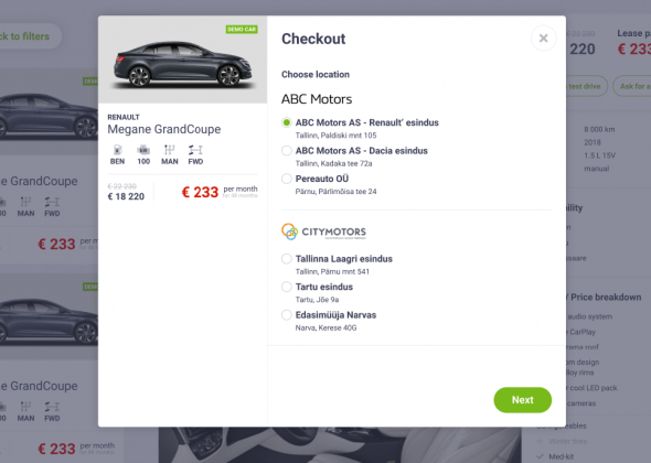 ✓ Faas 1 jooksul välja töötatud UI täienduste sisseviimine (otsingu vidin maandumislehele, sõiduki andmete ja nimekirjade lehed, testsõidu broneerimine)
